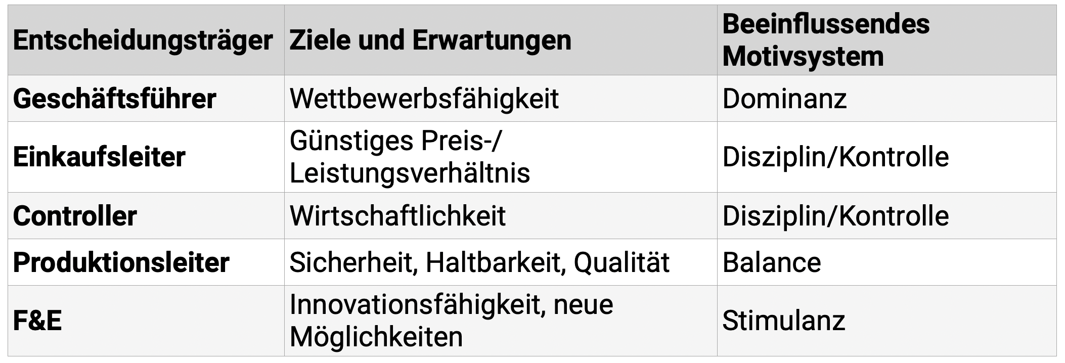 Implizite Codes und die Ansprache der Spiegelneuronen sind im B2B genauso wichtig wie im B2C. Sachliche und rationale Argumente allein entfalten hier ebenfalls nur eine begrenzte Wirkung. Trotzdem gibt es einige Unterschiede zu beachten. Im Konsumbereich trifft oft eine einzelne Person die Kaufentscheidung spontan, während im B2B-Bereich mehrere Personen und Abteilungen beteiligt sind. Psychologische Forschung zeigt, dass Menschen ihre Berufe und Funktionen entsprechend ihrem individuellen Motiv- und Emotionsmix wählen, was zu einer Homogenität in den einzelnen Abteilungsgruppen führt. Folgende Tabelle zeigt die Ziele und Erwartungen der verschiedenen Beteiligten im Entscheidungsprozess: